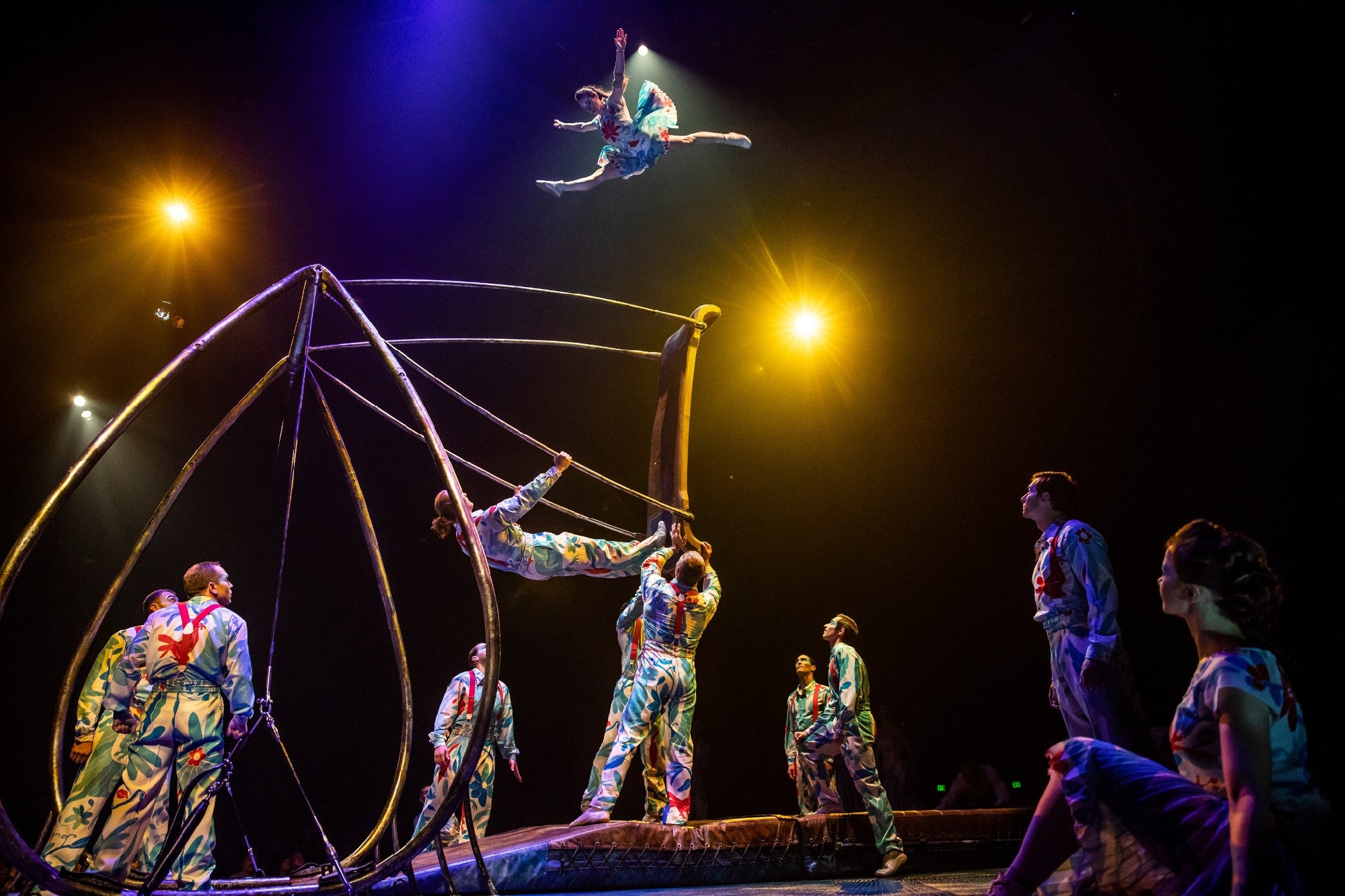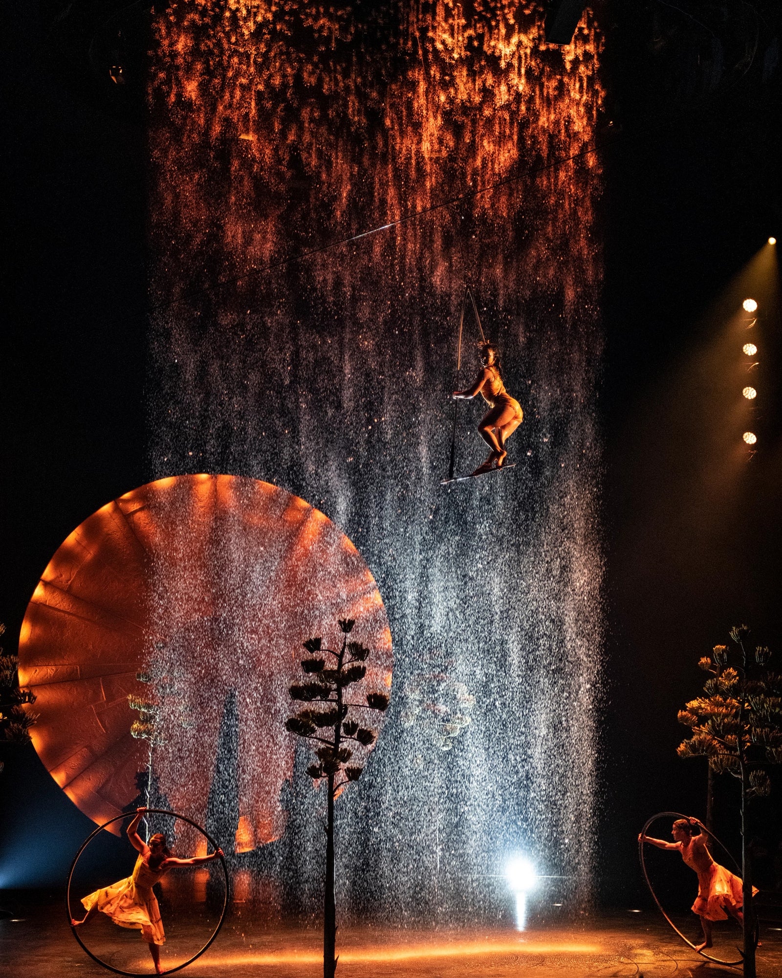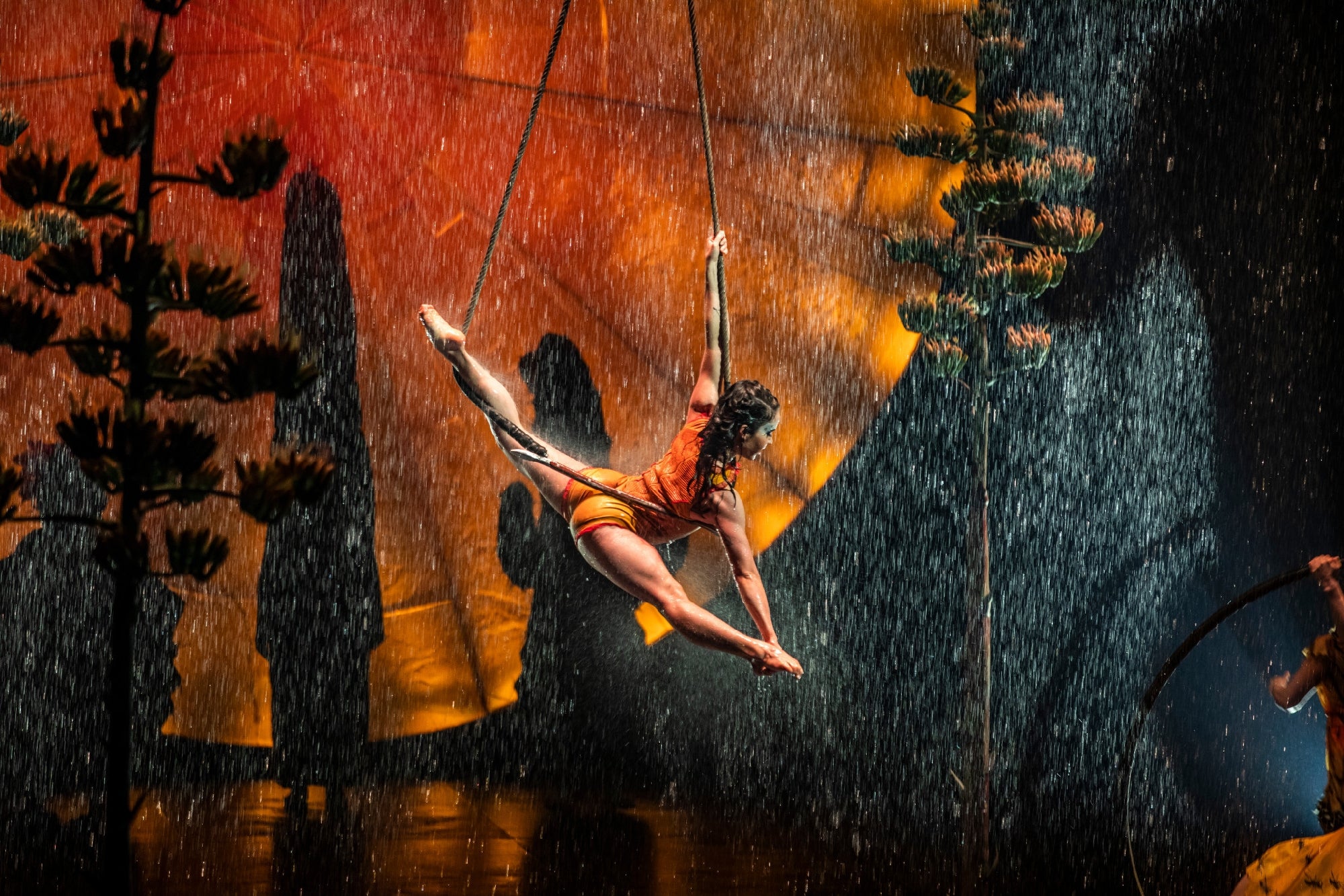 This production blends iconic Cirque artistry with innovative stagecraft — including a rain curtain effect where thousands of liters of water cascade through specially engineered holes in the stage. High-flying aerialists, Cyr wheel dancers, contortionists, and whimsical characters guide audiences through a dreamlike narrative that captivates all ages.