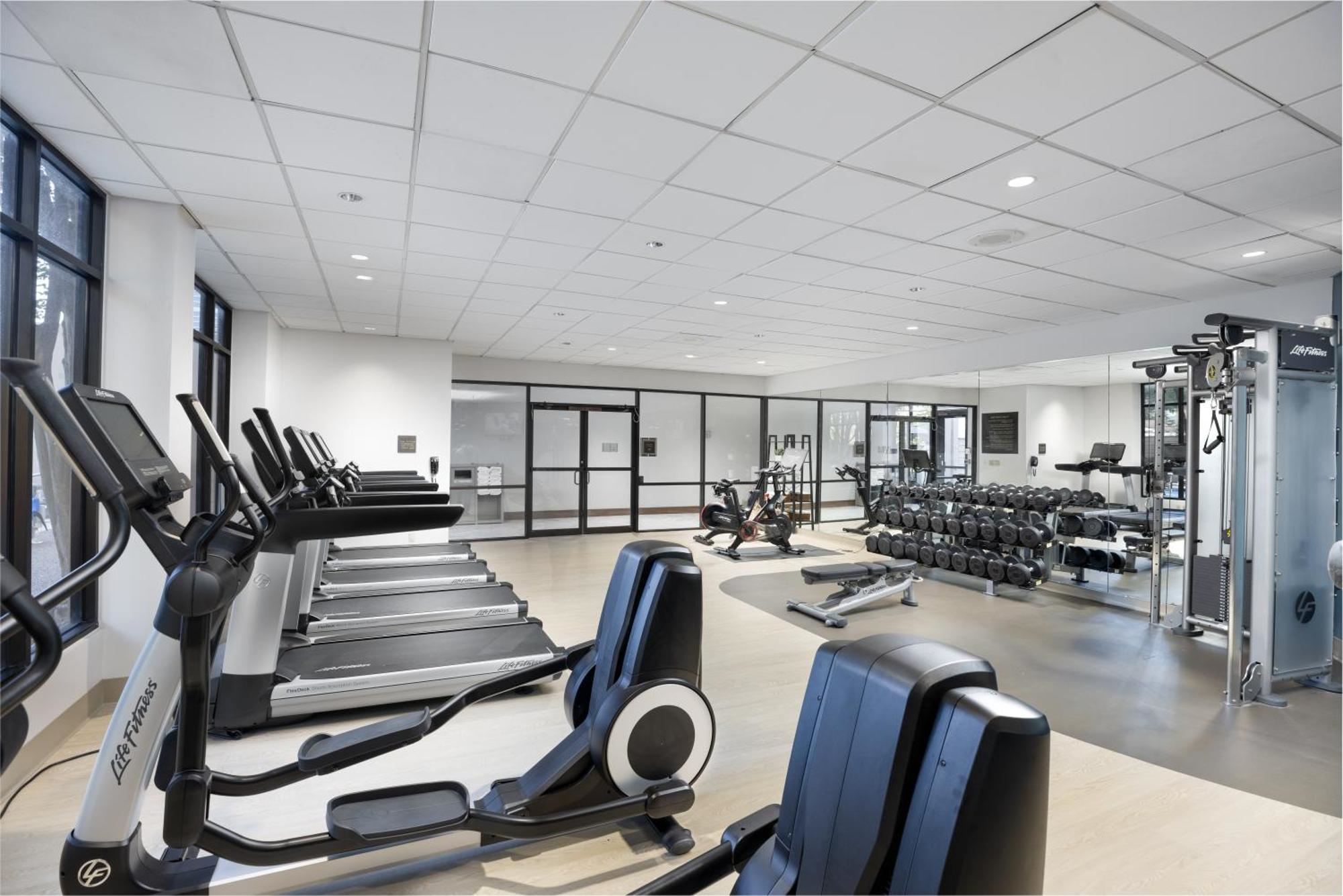 The hotel offers a wide range of accessible features, including an accessible business center, concierge desk, elevators, exercise facility, hotel restaurant, meeting rooms, and swimming pool. Accessible parking is available, with van-accessible spaces in the self-parking facility. Accessible routes are provided from the public entrance to guestrooms, the registration area, meeting rooms, business center, restaurant, exercise facilities, and pool. The hotel complies with ADA guidelines and includes features such as braille elevators, room numbers, lowered buttons in elevators, and vibrating fire alarms. Audible elevator alerts, strobe and visual alarms for the hearing impaired, grab bars in bathrooms, and wheelchair ramps are also available. Service animals are welcome, and accessible transportation can be arranged with advance notice. All public areas and rooms are wheelchair accessible, with bedroom and bathroom doors at least 32 inches wide. Please contact the hotel for specific accessible needs to ensure the hotel will be able to meet your requirements.
